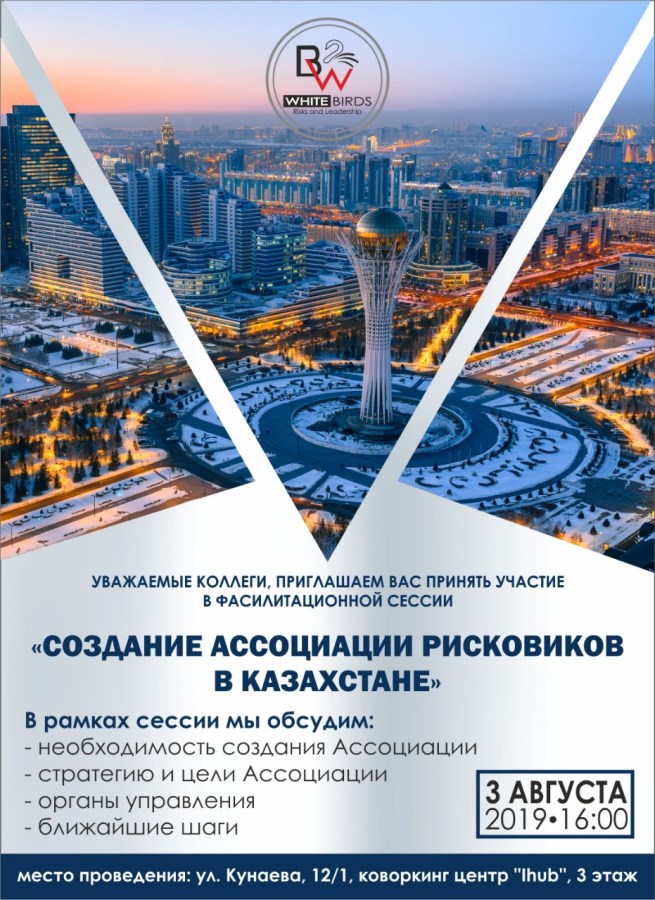 Мы рады сообщить, что наши партнеры в Казахстане команда White Birds – тренинго-исследовательский центр приглашают профессионалов из области риск-менеджмента принять участие в фасилитационной сессии, целью которой является обсуждение инициативы по созданию Ассоциации рисковиков в Казахстане.