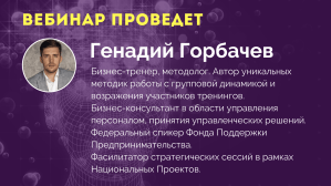 Вебинар проведёт Геннадий Горбачев, Бизнес-тренер, методолог. Автор уникальных методик работы с групповой динамикой и возражения участников тренингов. Бизнес-консультант в области управления персоналом, принятия управленческих решений. Федеральный спикер Фонда Поддержки Предпринимательства. Фасилитатор стратегических сессий в рамках Национальных Проектов.