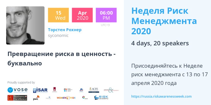 Оценка проекта, инвестиции, компании или иного актива очень важна при принятии правильного бизнес-решения. До сих пор мы часто полагаемся на “не всем понятные” методы оценки. В этом аспекте Torsten опишет логический системно выстроенный и практически применимый подход по оценке с учетом риска любого проекта, инвестиции или иного актива, используя симуляцию на основе метода Монте-Карло. Он продемонстрирует, насколько доступно можно использовать информацию о рисках, которая уже существует в ваших моделях, вместо необоснованных и случайных предположениях о «премии за риск».