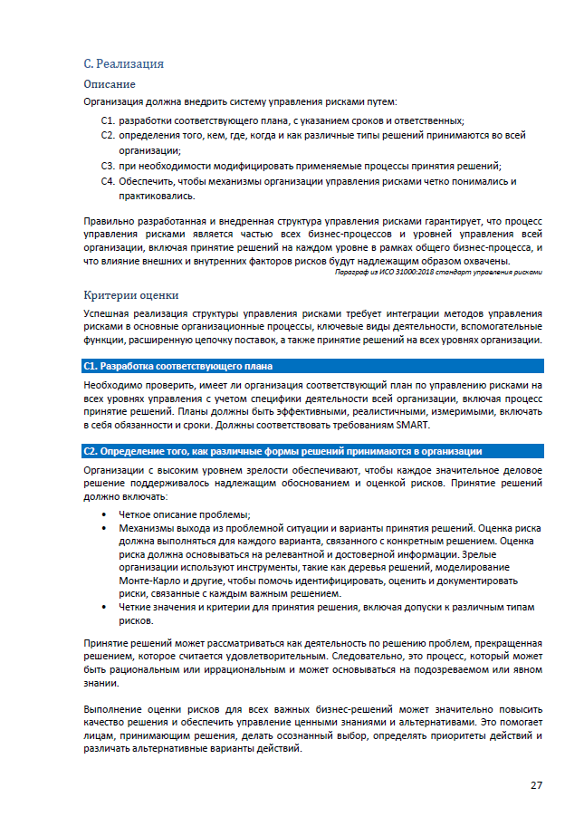 Автономная некоммерческая организация дополнительного профессионального образования «Институт стратегического анализа рисков управленческих решений» (АНО ДПО «ИСАР») совместно с Global Institute for Risk Management Standards разработали данное пособие и модель внедрения и оценки эффективности управления рисками (Risk Management Maturity Model, RMM) для организаций, которые стремятся улучшить качество принятия решений на всех уровнях организации. RMM была разработана в соответствии с принципами ISO 31000:2018 Risk Management. Модель содержит рекомендации, бенчмаркинг, критерии оценки и может использоваться подразделениями по управлению рисками, внутренним аудитом, внешними консультантами и Советом директоров.