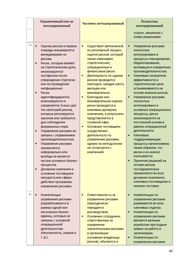 Эта модель не относится к какой-либо отрасли или сектору и может применяться к любому типу рисков, независимо от их характера и того, будут ли они иметь положительные или отрицательные последствия, или их сочетание. Модель может применяться на протяжении всей жизни организации и для широкого круга пользователей/процессов внутри организации.